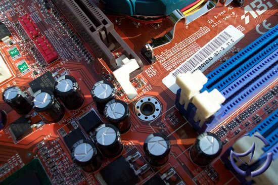 The CPU socket is setup in a more traditional manner that we're used to seeing on Pentium 4 boards, with the key facing to the right (as pictured) of the motherboard. There's nothing noteworthy about the alignment, other than it may be a little to close to the edge. There's enough clearance for most heatsinks, and the capacitors don't get in the way when installing the retail heatsink clips. As with past ABIT boards, Rubycon capacitors are used here, and they are of high quality.