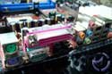 Moving to the left, we get a look at a sweet looking Northbridge HSF, which is the same one used on the IC7. There are clamps used to hold the heatsink down, which makes swapping it, or reapplying thermal paste, an easy task since you won't need to remove the motherboard as you would if there were push pins. ABIT used a thermal pad, but we recommend removing it and applying some quality thermal paste.
