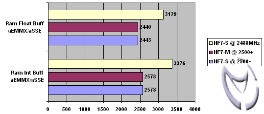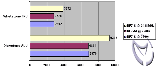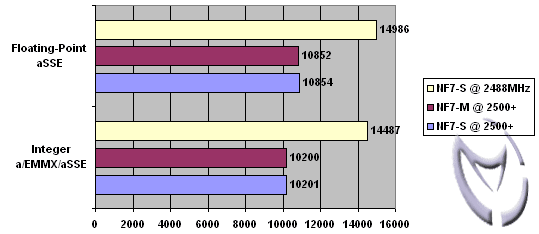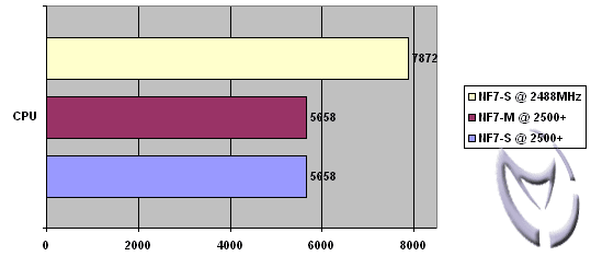 Both the NF7-M and NF7-S perform very closely with each other. The NF7-S does hold a slight lead, perhaps suggesting optimizations with the v2.0 PCB, but not enough for us to flat out state this as fact. Overclocked scores are truly impressive, and keep in mind we were unable to get anything near this with the v1.2 PCB.