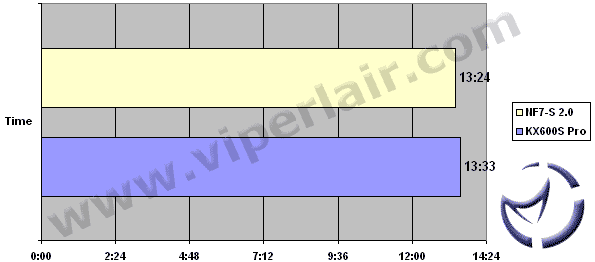 Not much of a difference between the two setups, but the nForce 2 setup does hold a slight one second lead at the same clock speed as the KT600 board.