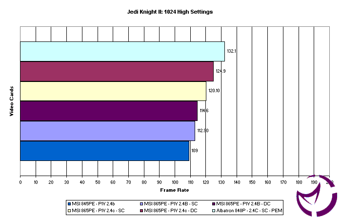 Here we see that UT seems to like PEM and the lower timings of the Albatron board. It performs better than the 865PE board in single channel mode, though the difference is less than one percent. It can't quite reach the speed of the dual channel version of the 865PE, but still offers good performance in this test. How about Jedi Knight II?