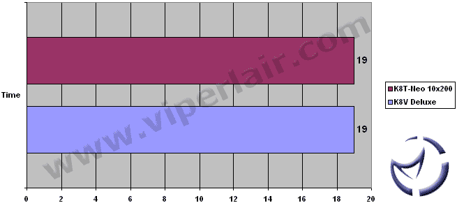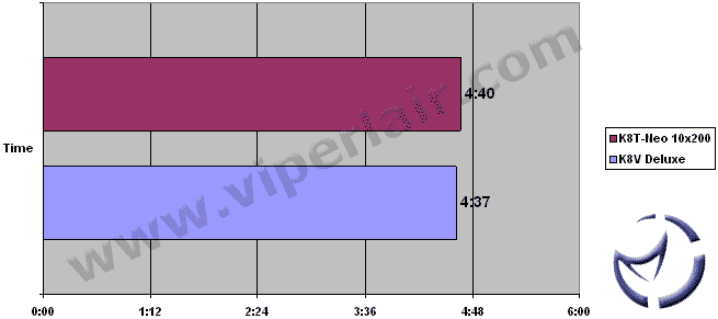 The K8T Neo manages to beat the K8V Deluxe by a mere .06 seconds, so they are pretty much dead even. If crunching numbers is your game, the K8V won't let you down.