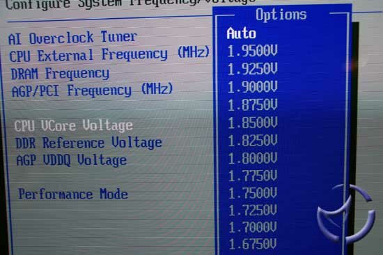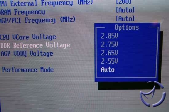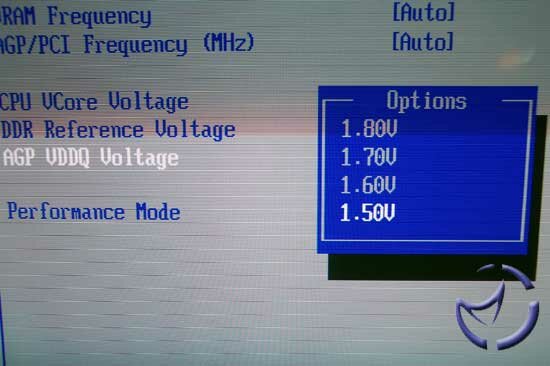 Naturally, as you begin to overclock components, you'll need to be able to increase the voltages to maintain stability. You can go as high as 1.95v for the CPU, 2.85v for ram, and 1.80v for AGP. I would have liked to have seen some higher memory voltages as many of todays PC4000 modules can handle up to 2.9v, which may be necessary at 250FSB+.