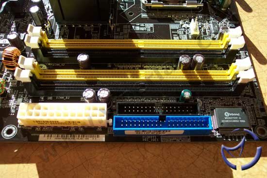 Located below the ram is the 24-pin power connection, floppy connection, and PATA connection. The 24-pin power connection is backwards compatible with 20-pin ATX connectors. The location of these connections is where we normally prefer them to be as it keeps the cables away from the center of the board.