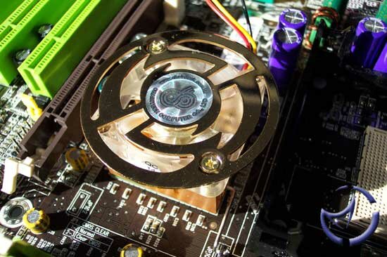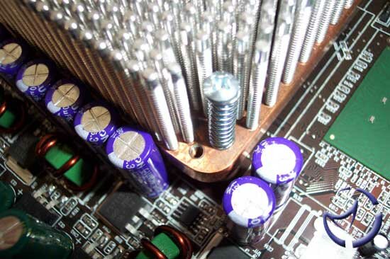 Chaintech uses a nice gold heatsink and fan combo (as well as the biggest fan grill I've seen on such a small fan) to cool the Northbridge down. The Northbridge doesn't run very warm, but when you're overclocking, any extra cooling will help. In case you're wondering, the fan grill on the Northbridge does not get in the way of heatsink installation.