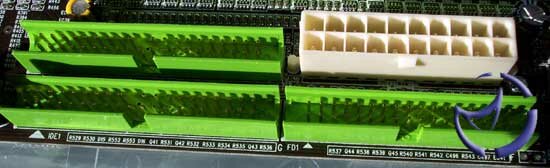 On the otherhand, the connection required for Pentium 4s is in between the capacitors and the back I/O panel. Luckily, the power cord for this connection isn't very obstructive, but it would have been better to move this power connection further away from the socket.