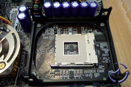 The CPU socket is for Northwoods only, and includes the Intel heatsink retention bracket. This is something which you can remove for a larger cooler such as the Swiftech MCX4000.
