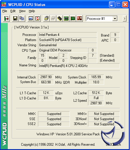Chaintech 9EJS1 Zenith: Pentium 4 2.4B (18x133: 2.4GHz), 2 x 256MB Crucial PC2700 Ram, ATi Radeon 9700 Pro, 120GB Western Digital SE 8MB Cache, Windows XP SP1, Intel Application Accelerator v2.3, ATi Catalyst 3.0