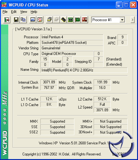 MSI i845PE Max2-FIR: Pentium 4 2.4B (18x133: 2.4GHz), 2 x 256MB Crucial PC2700 Ram, ATi Radeon 9700 Pro, 120GB Western Digital SE 8MB Cache, Windows XP SP1, Intel Application Accelerator v2.3, ATi Catalyst 3.0