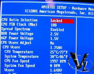 The Hardware Monitor Setup lets you overclock the computer in a multitude of ways. You can tinker with the CPU speed (unless your CPU doesn't allow it), and the Front Side Bus along with the voltages of the AGP and DDR slots. Almost standard these days, MSI includes CPU Temperature and System Temperature in this section of the bios, along with CPU and system fan speed.