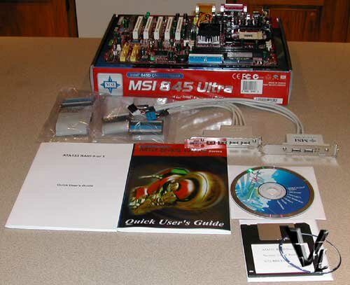 Out of the Box, you get two IDE ribbons, one floppy ribbon, a GREAT users guide (which includes everything you would ever want to know about the card and software), 4 USB 2.0 and 2 USB 1.1 ports, a RAID manual, and driver disks.