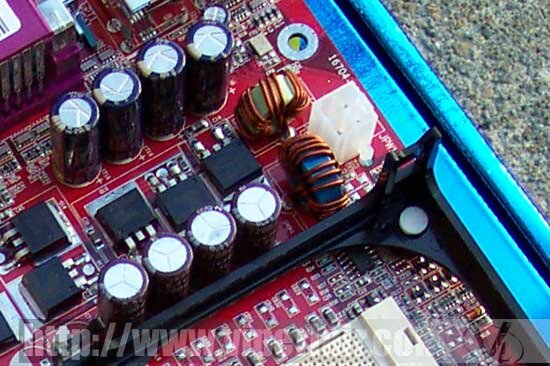 Power connections aren't really in our favorite places, and the main ATX connection on the right side may cause issues if you're planning to use an oversized CPU cooler. Capacitors are located on the left side, again, a little too close for comfort for us. That being said, I drop fitted the Volcano 7+ and Swiftech MCX462 (with P4 adapters), and both fit fine. The small four pin 12v connector is located on the left side, which may cause the wiring to drape nearby the heatsink.