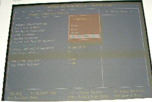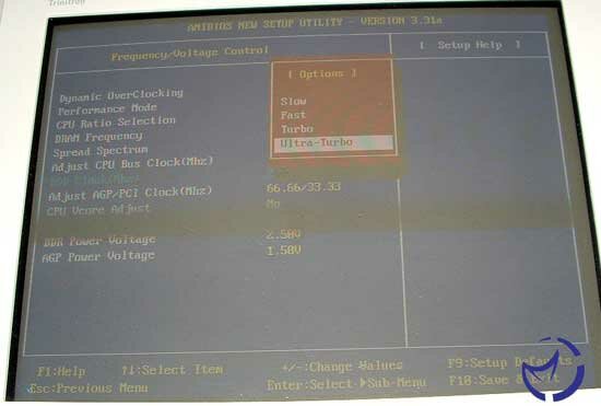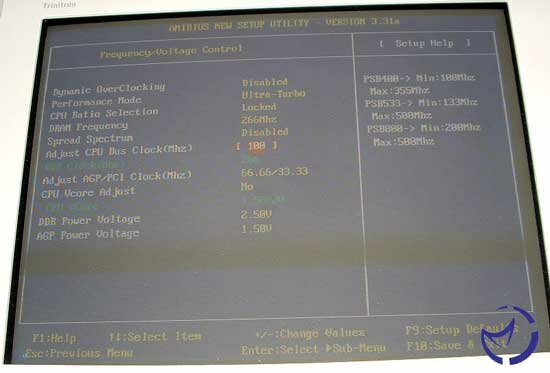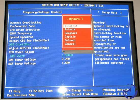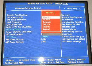 Now we will look at the spot where most of the tweaker/overclockers time will be spent, in the Frequency/Voltage control. With BIOS revisions after 1.2, you get the option for "Dynamic Overclocking" with some very interesting names for the varying levels, in a miltary theme from Private to General (just make sure that the General setting doesn't give you a protection fault). Next is the Performance mode, which basically controls the memory settings, though why the actual memory settings aren't here is odd, but apart from that it gives you some standard options: Slow, fast, turbo, and Ultra-turbo. The Ultra-Turbo option gives you the fastest settings that there are, of 2-2-2-5. Next is the FSB control, which allows you raise the FSB to either 355MHz or 500MHz, though how it is possible to reach these FSB speeds is frightening to me. However if you found a CPU that would do that, then this board has the options you are looking for.