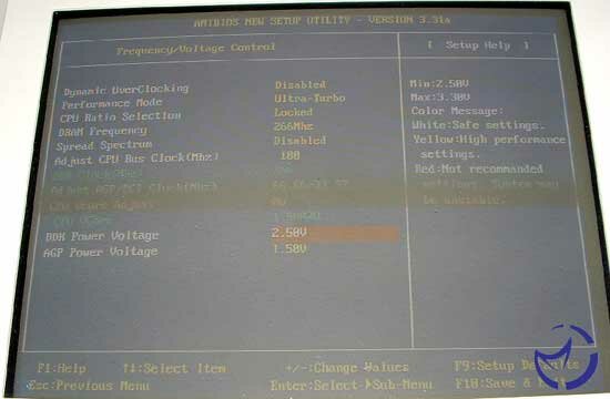 Lastly is the voltages, the CPU can go up to 2.3v which is scary for all but the most 'hardcore' overclockers. The DDR voltage can go up to 3.3v which is slightly higher than I've taken my RAM (3v) but gives that extra headroom if you need it. The AGP voltage goes up to 2.2v though there is an option to lock the AGP/PCI buses so that this isn't as necessarily needed as much, unless you want to overclock the AGP bus speed to get those extra few fps out of your card. A nice feature that MSI has included for the voltage settings is a color coded markers which tell you when you are reaching the danger zone for the piece that you are applying the voltage to. I must say that at least in theory MSI has provided some of the best overclocking options for a user to play with out of the motherboards I've tested so far.