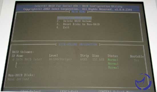 The start up screen for the Intel RAID is fairly plain, telling you what arrays you have defined and what you haven't defined. It also shows that you need to press ctrl and I to enter the menu for the configuration of the array. A note is that this menu does move slightly quickly, so I would be ready to press the key's pretty quickly if you want to enter the menu. The configuration menu allows you to create, delete or reset the array, which is pretty standard for any RAID menu. You have the options for changing the strip size from 16KB to 256KB with 64KB being the default setting and the one I used for testing.