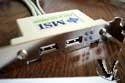 Although USB 2.0 is backwards compatible with USB 1.1, MSI suggests that mice and keyboards are kept off these newer connections. The bracket pictured at the lower left provides legacy USB support, as well as monitoring LEDs for visual trouble shooting. The bracket to the right is for the high speed USB 2.0 devices.