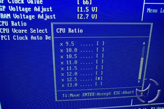 The first order of business is to lower the multiplier to a level that we can maximize our FSB. As usual, we move the FSB in small increments until we reach a point of instability. At a multiplier of 8x, we were able to hit 198. The system would POST at 199, but Windows became so badly corrupted, a reformat was in order. After the reinstallation, I tried a multiplier of 7x, but we were not able to get by 199. Seeing how the ceiling is 200FSB, I called it a day for FSB overclocking, and begun pushing the multiplier up (at 198FSB) to see what was the maximum multiplier/FSB overclock we were able to manage.