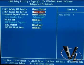Moving on, you can make changes to various integrated peripherals. Your options are fairly limited, as you can only choose to enable or disable your devices. If you plan on using the included GeForce 2, the overclocking is set in Windows, so you don't have much in the way of overclocking it in the BIOS. Be aware that you will lose 32MB of system ram to the video.