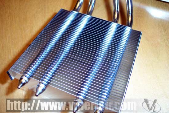 The next couple of pictures are of the heatpipe itself. The heatpipe is surrounded by thin fins to help distribute the heat, which is in turned cooled down by a Sunon fan. The fan itself is of the speed control variety, but works in conjunction with the BIOS. You can set at which temperature(s) should the fan speed up. At its lowest settings, it was fairly quiet, but at the higher speeds, the noise is quite noticeable.