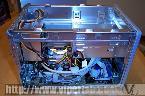 Inside the case, you have the pre-installed motherboard, as well as the cooling and hard drive rack. Although one would think that such a small case would be difficult to work with, the Shuttle SS51 is actually a snap to get in and out of.