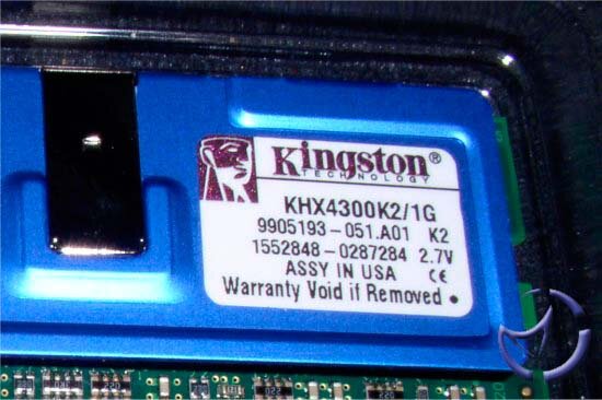 Closer inspection of the ram sticks shows a sticker in the right corner of one side which gives us such information as the default voltage and memory speed. The part number is given, KHX4300K2/1G, which tells us it is PC4300, and one half of a 1GB kit (hence 512MB). The maximum voltage is indicated as 2.7v, which is more or less in line with what we've seen with other PC4000+ modules. The timings aren't indicated on the module, but according to specifications, the timings are 3-4-4-8-1.