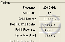 Since we're using a 200FSB (800MHz) ABIT IC7-MAX3 motherboard, the first thing I wanted to try was what are the tightest timings I could run the HyperX at at 200FSB. After a bit of tweaking, it seems that 2-3-3-6 is about as low as I can go.