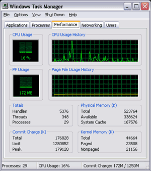I took a reading after about 1 minute after Windows XP finished booting. The value actually fluctuated between 0% - 5%, but for the most part, it was 0%. On the right, you'll see CPU Usage at about 16%. Again, there was some fluctuation where it went as low as 8%, and as high as 30%. The big spike of 100% you see there is on the initial spin up of the DVD. Conclusion? I'd say that you can expect about 20% CPU Usage when watching a movie. This is ok I guess, since there's still quite a bit of CPU time left for other tasks, but it's a far cry from the 5% - 10% max I used to get from my hardware DVD decoder.