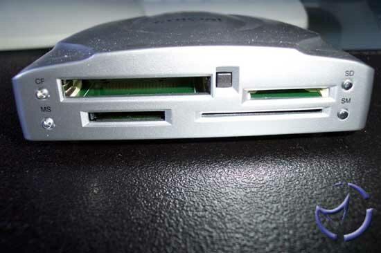 Cards are inserted through the front of the device. There are only four slots available, but a couple serve dual memory types. There is one slot for Compact Flash/IBM Microdrives, one slot for Memory Sticks, one slot for SD/MMC cards, a slot for Smart Media Cards.