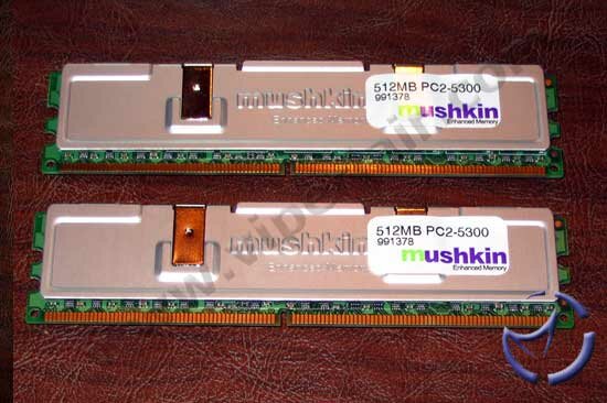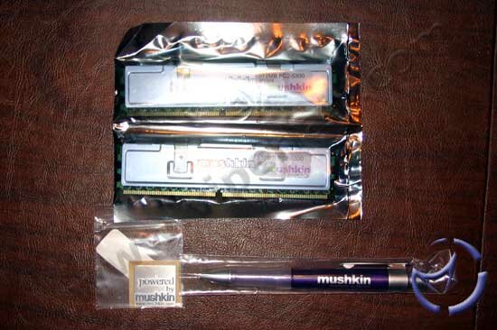 The package that I received from Mushkin contained 2x512 MB PC2-5300 DDR 2 modules, 1 metal Mushkin case badge, and 1 ink pen. I have traditionally been used to reviewing Corsair memory, in which the more recent modules have elaborate heat spreaders with LED's and all kinds of other crazy gadgetry. These Mushkin modules, however, appear to be all about business as they sport the more traditional plain heat spreaders. I see absolutely nothing wrong with this, as flashy LED's on your memory modules are only of a small amount of use. There was also no fancy packaging, just sealed anti-static packaging housing the individual memory modules.