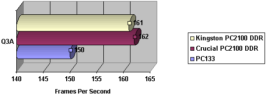 Synthetic benchmarks are good to get an idea of how something performs relative to another product, or to set a baseline, but real world testing is where you can test a product's real performance. I chose Quake 3: Arena, since I'd imagine most of you are gamers, and Q3A is one of the few games that can benefit from faster ram. For the tests, I will be using a 1.4GHz Thunderbird, to test PC133 SDRAM, and I've included the Kingston scores here as well. I did not overclock for this test.