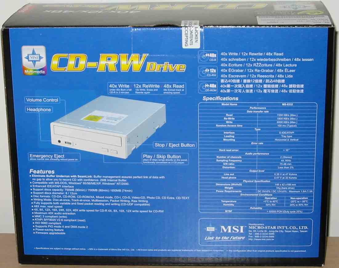 MSI is a relatively new player in the CD-RW market. They have started to diversify from their established motherboard business, into video cards and even CDR's, one of which we are looking at today. The first CD-RW from MSI was released in early/mid 2001 and was the MS-8312, a 12X8X32 CD-RW. Since then MSI has increased the speed of their CDRW's in an almost sequential sequence from 12X to 40X, for the CD-R writing speed.