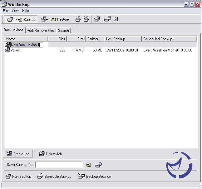 Upon first run a simple popup wizard guides you through setting up a backup 'Job' for the first time. In Winbackup a 'Job' is a template that outlines to the program what exactly the program should backup and how. The wizard will ask you to click on "Create Backup job", where a new job will be added to the list.