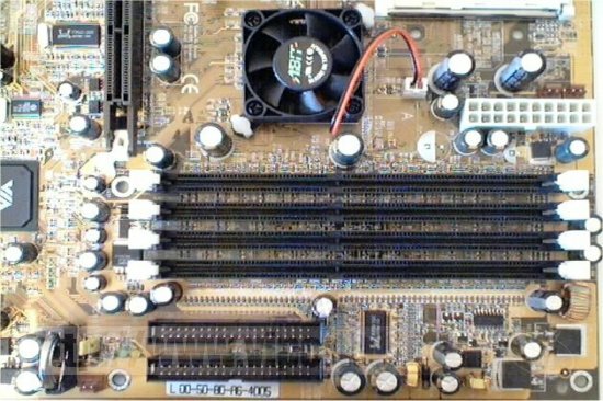 4 Slots for memory are found here, compared to most other boards that give you 3. I found that capacitors on the top of the board and large Graphics cards in the AGP slot, whilst not actually stopping me from removing the ram, did stop me opening the clips for the ram fully.