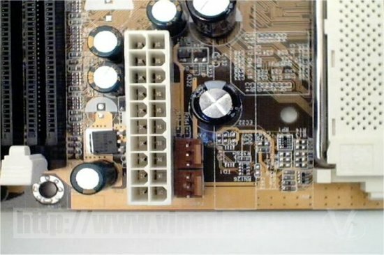 The power connecter sits between the zif socket and the DIMM slots at the top of the board. This is a great place to put it as it means that your power cable won't be draped across your HSF or any other components on the board. You can also see next to the power connecter 2 of the 5 fan headers. These appeared to be too close, but installation of a 3 pin fan wasn't a problem at all.