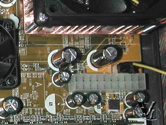The IDE headers are located to the far right of the board about halfway up and are coloured green, with the ATA133 RAID coloured yellow and floppy header, lower down. This could cause problems to some, in that if you have a full tower case with the floppy drive at the top, you will need an extra long lead for it to reach. The whole layout of the board gives a very clean impression, and with exception of that 4th DIMM slot graphics card problem, and for some the floppy drive connector, it works very well.