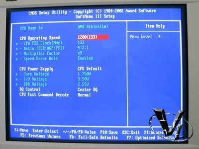 The KR7A supports all the latest AMD CPU's straight out of the box, including correct display of each during post, so if you have an XP1900+ it will say it's an XP1900+ not a 1600 whilst the true speed of the CPU is displayed in the bios. One thing I did find surprising, is that just like the KG7, the thermal diode for the XP chips is once again not supported. I would have thought this would have been there, but ah well. There is the thermal probe placed inside the CPU socket itself, which I had to bend up a little to make sure of good contact, but this won't stop you from frying your chip in the way the thermal diode would have done. Don't let this put you off though, people have had to do without the thermal diode on the Thunderbirds for ages now, so whilst it would have been a nice safety addition, it isn't something I would use as a deciding factor against this board.