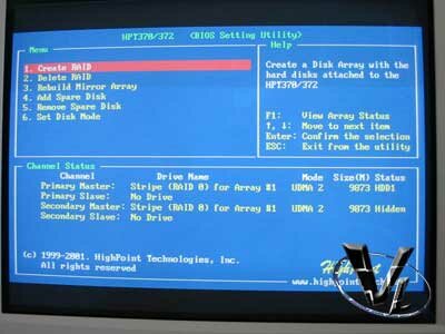 The HPT372 IDE RAID controller is featured on this board, and works very well indeed, with a surprisingly easy setup. I have never even seen a Raid setup before, and even I was able to have an array set up and configured to go in seconds thanks to the High Point Raid BIOS setup (if I can do it, so can the dumbest of people ).