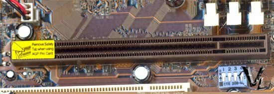 The A7V266-E includes an AGP Pro slot. There's a plastic tab that'll prevent users from improperly seating their regular AGP cards. Though this won't really matter for the majority of users, CAD and workstation types can plug in your fancy OpenGL cards here.