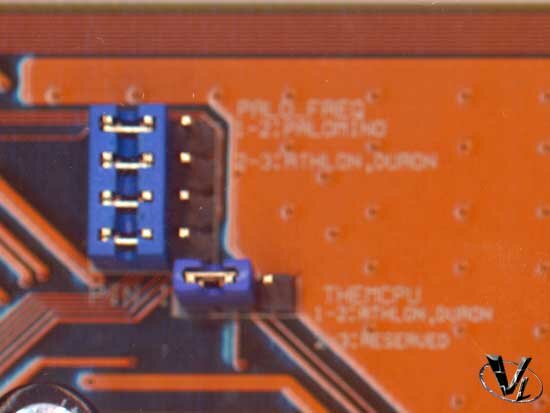The (blurry) pic above are the jumpers for the CPU. Our default was 1-2, which will enable support for Palominos, or Athlon XPs, whereas 2-3 is for standard Durons and Athlons. The jumper below it, labeled "ThemCPU" is for thermal sensor capability. It's not stated what "reserved" is for, but initially, our Athlon XP 2000+ was reporting temperatures of 68C, which is way to high. Switching to "reserved" lowered temperatures by over 20C. Just a FYI: The A7V266-E does not make use of the internal diode present in Athlon XPs. It uses the older method of integrating the thermal monitoring in the socket itself. Although not as effective as using the built-in Athlon XP diode, it does report more accurate temperature readings than a simple probe.