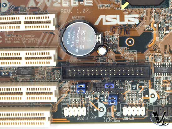 One annoying feature of the A7V266-E is the placement of the floppy connection. Why it needed to be placed in the lower half of the motherboard, next to IDE4 and IDE5 is beyond me. Anyone with a tall case, where the floppy bay is at the top, is going to have fits getting the cable to reach. Asus includes a fairly long floppy cable, so unless your tower is unusually tall, you should be fine. Also pictured above are the additional USB connections. Sorry, no USB 2.0 here, but if you have a lot of USB devices, you'll be happy with this board. A daughtercard (not pictured) for additional USB ports is included.