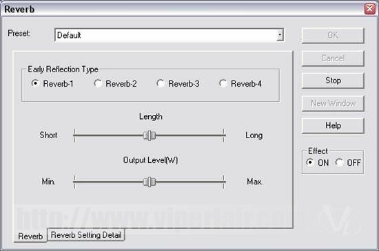 The reverb settings are great, with a little bit of patience you can create a passable 3D effect. A lot of these settings by the way not only have more advanced controls (obtained by switching to the appropriate tab within each effects window) but also presets. So in the case of the reverb, you can set the sound for perhaps a stadium or a church, or simply a small room via a pull down menu.