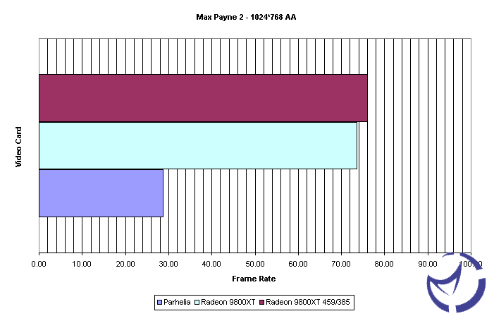 Max Payne 2: The fall of Max Payne is similar to the original game but offers some improved graphics while still sharing the same cheesy type storyline of the previous game. The quality of the graphics presented in this game do test the video card very much. Our test takes place on the last level of the game, which gives us a good amount of bodies to render, as well as fire and fog effects. Lets see how the 9800XT fairs against itself and the Matrox Parhelia in this test.