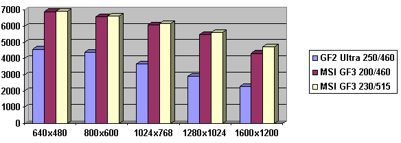 With FSAA enabled, things get a little rough on the GF2 Ultra. There's a lot more information being processed, and thus increasing demand on the memory pipeline. At the lower resolutions, it's still playable on the Ultra, but this is where we see the GF3 showing it's muscle. I didn't include overclocked scores because although this is the second graph I'm showing, it's actually the last benchmark I did. I mention last page that my video card was crapping out on me at this point. Oh woe be me....