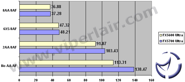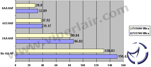 With no AA and AF enabled, the FX 5700 is a good deal faster at both resolutions. Even when we move up to 2xAA/8xAF at 1024x768, performance is still good. Like the FX5600 Ultra, don't plan to play online at 8AA/8AF unless you like to spend your time getting fragged.