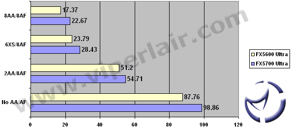 Wolfenstein's Checkpoint demo is one of the more intense Quake 3 Engine tests, and the FX5700 handles it without a problem at no AA/AF and 2xAA/8xAF, though it takes quite a nosedive at 8xAA/8xAF. With NoAA/AF at both resolutions, there is a large gap between the two cards, though this gap lessens as AA/AF levels increase.