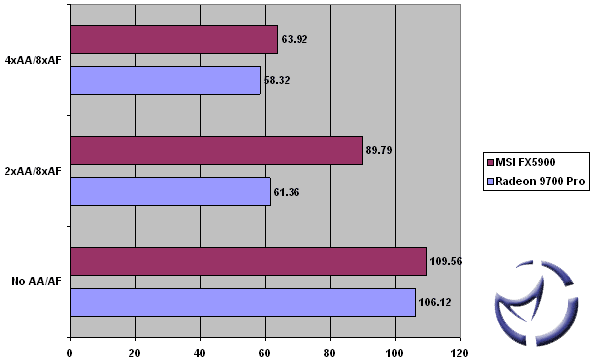 The Citadel heats things up between the two cards at 1600x1200 with the FX5900 taking the lead at 4xAA while falling behind at 2xAA. As in Antalus, at 1280x1024 the FX5900 continues to enjoy a sizeable lead.