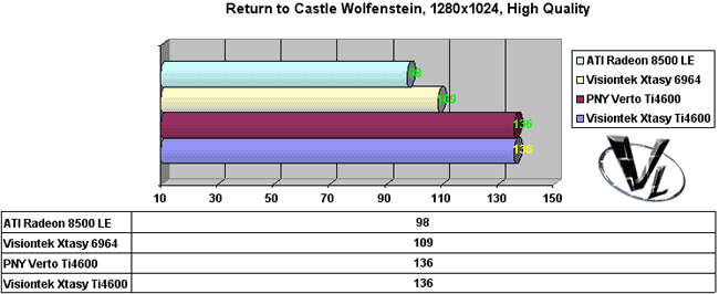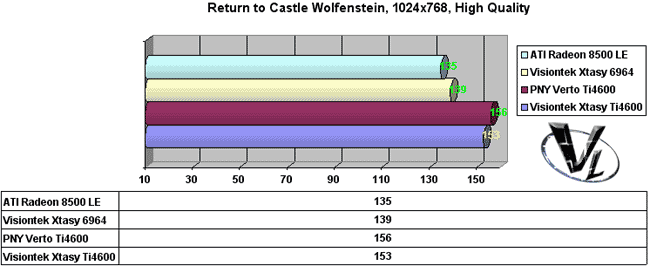 At over 150 frames per second, at maximum resolution, this is an impressive showing indeed, besting the previous "framerate kings" by over 25%. The differences between the PNY Verto and Xtasy Ti4600 are less than 1%, and well within our margin of error.