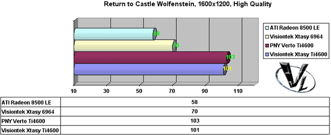 The GeForce 4 Ti4600 flexes it's high resolution superiority by over 30%, when compared to the competition. Still, the older Ti500 and Radeon 8500 do very well, and any framerates in excess of over 150 will do more than enough for most people. Then again, with this much power in the Ti4600, why not go for more?