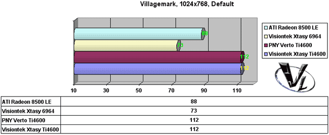 At 1024x768, this is the closest we've came to 10 000 3D Marks. Obviously, with a bit of tweaking, that number would have been attainable. It's about 15% behind, but the Radeon 8500 shows that it's still a contender for Direct 3D. I'm not really sure why the PNY kept scoring about 4% lower than the Visiontek, but that was the best I was able to manage out of it.