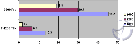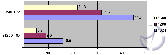 At all resolutions, the 9500 Pro is keeping consistent by besting the Ti4200. With no anti-aliasing or anisotropic filtering, the 9500 Pro holds a large lead over the Ti4200. When you start turning on AA and AF, the gap just flat out widens. The 9500 Pro loses about 60% of its performance at 1024x768 when moving to 4xAA, 8xAF, and the Ti4200 loses approximately 78%. In saying that, the Radeon 9500 Pro is still somewhat playable, but you can forget about it with the Ti4200, unless you like getting fragged a lot while watching the slideshow. At 1024 resolution, the 9500 Pro still stays above 40 frames per second at 6xAA and 16xAF (the Ti4200 cannot support this level of AA and AF), but any resolution higher than this will make for some jerky gameplay.
